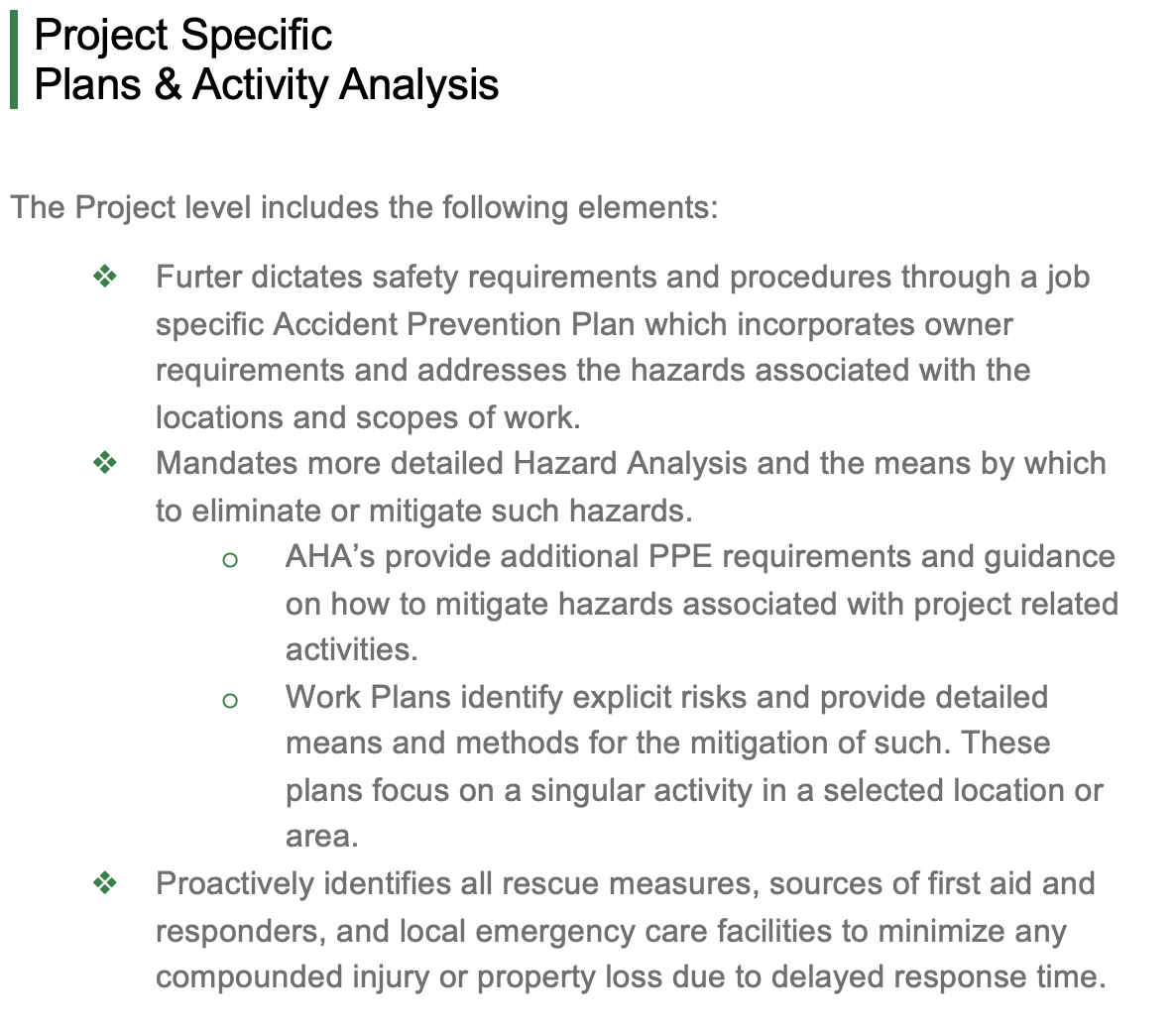 Green maintains a steadfast commitment to Health & Safety and has developed a comprehensive Program to position ourselves, our subcontractors, and our clients for success in the safety arena, and the overall conduct of our mutual business.